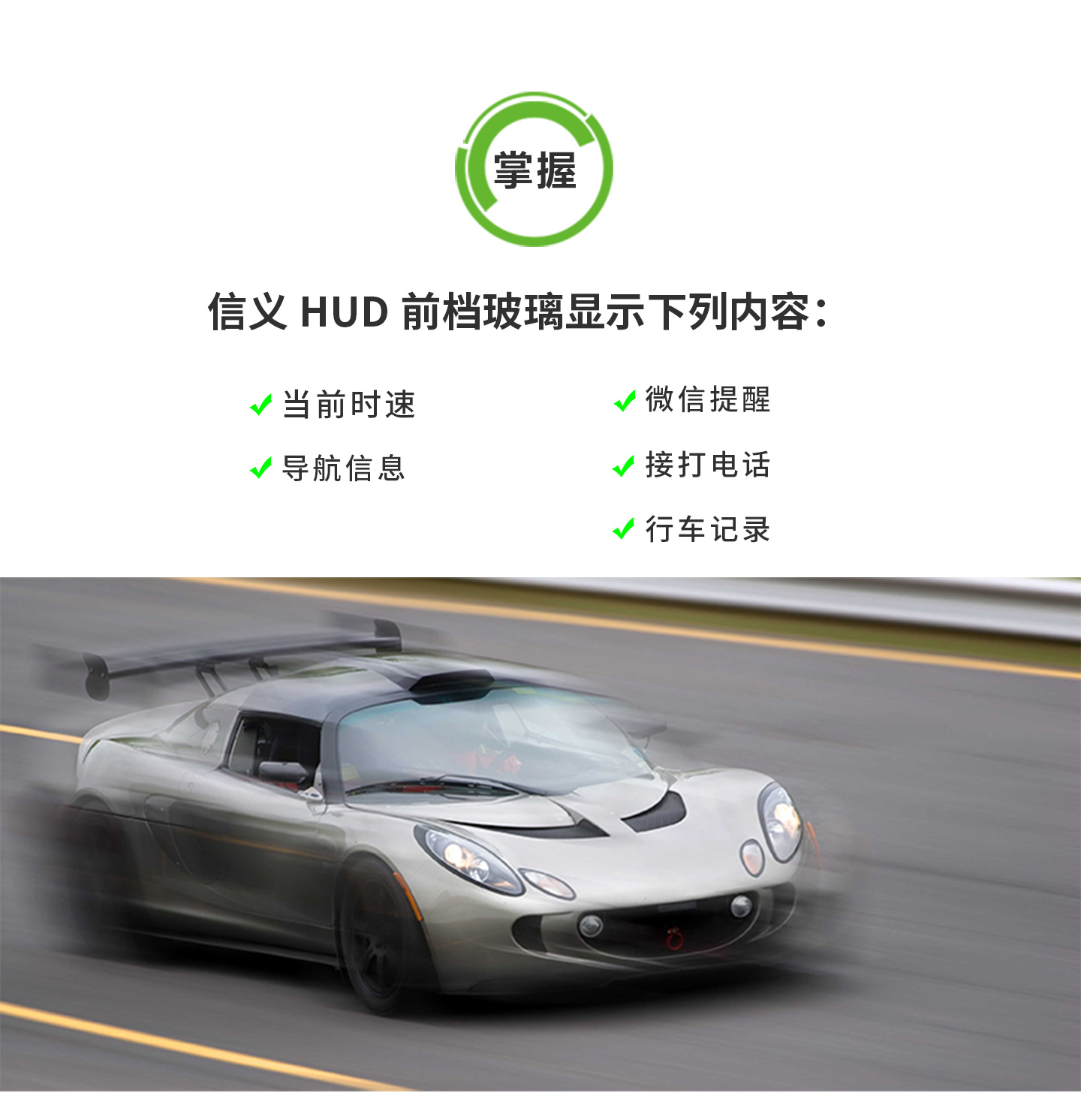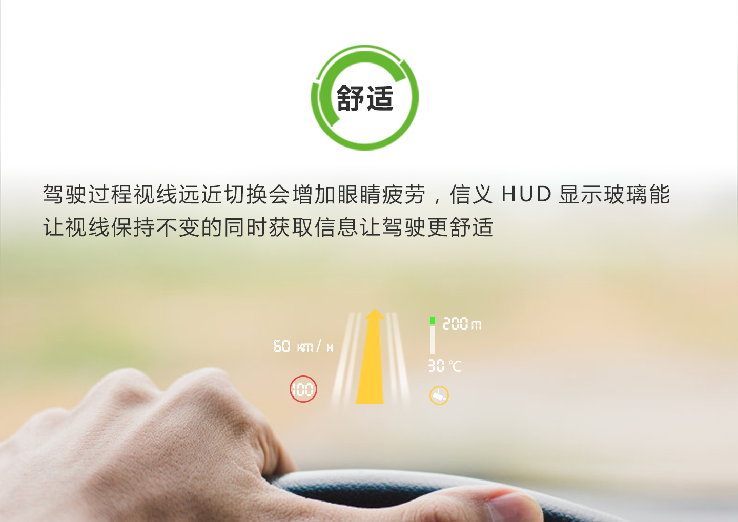 抬头数字显示仪(Heads Up Display),可将行车信息(时速、导航、油耗等)投影到前挡玻璃,可更集中注意,保障行车安全。