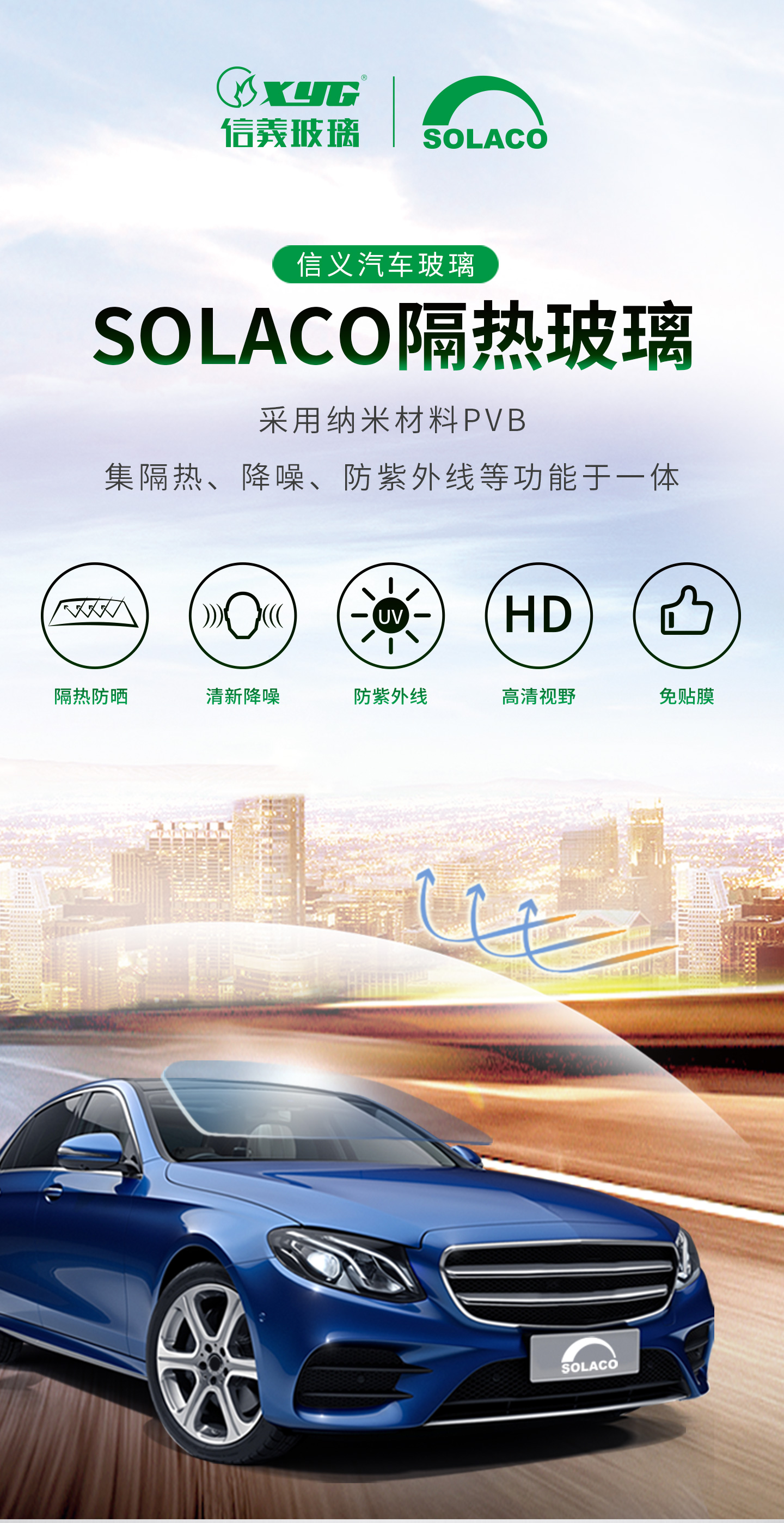 由信义玻璃自主研发的一款新产品,采用纳米材料PVB,集隔热、隔音、防紫外线等功能于一体