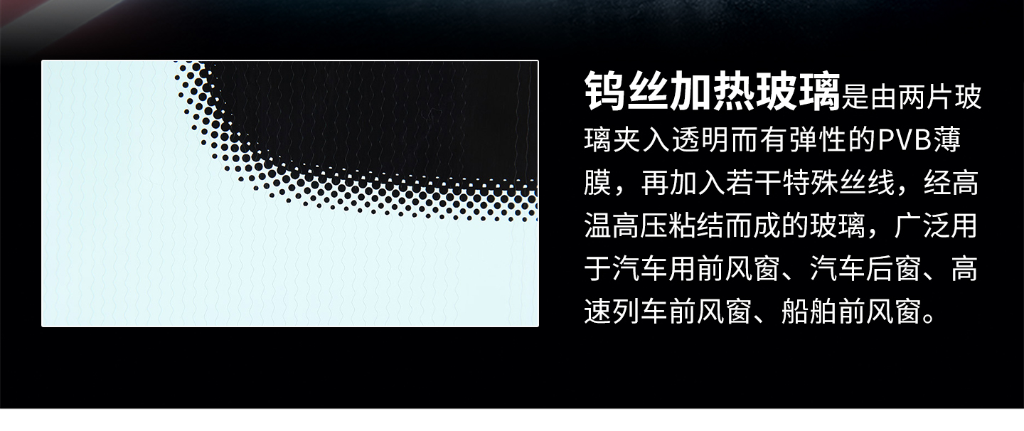 通过将钨丝分布在玻璃夹层中间的PVB膜上,并将钨丝通电发热的汽车玻璃,快速除霜除雾,保证清晰视野!